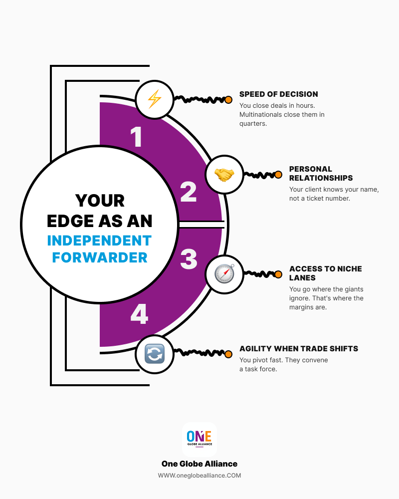 Yes. Independent forwarders compete effectively by leveraging advantages that scale destroys: decision velocity (hours vs. quarters), personal client relationships, niche corridor specialization, and rapid adaptation to market shifts. While they can’t match DHL’s global volume discounts, they consistently outperform on service flexibility and crisis responsiveness.